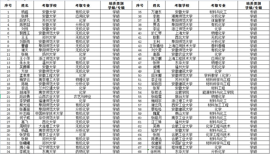 2021年,我院271名毕业生中有165人参加硕士研究生考试,最终有68名同学考取硕士研究生,录取率为41.21%。其中33位同学考取了中国科学技术大学、大连理工大学、东南大学、南京师范大学、合肥工业大学、西北大学、苏州大学、福州大学、安徽大学、郑州大学等“985工程“、”211工程”高校。