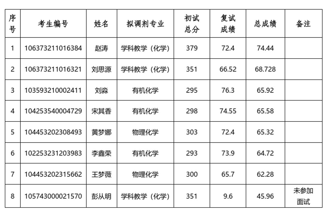 根据教育部《关于印发<2023年全国硕士研究生招生工作管理规定>的通知》(教学〔2022〕3号)、《关于做好2023年全国硕士研究生复试录取工作的通知》(教学司〔2023〕3号)和安徽省高等学校招生委员会 安徽省教育厅《关于做好安徽省2023年硕士研究生复试录取工作的通知》(皖招委〔2023〕4号)等文件精神,按照安徽省2023年硕士研究生招生录取工作会议要求、阜阳师范大学化学与材料工程学院2023年硕士研究生复试录取工作方案。现将我院2023年全日制硕士研究生第二批调剂成绩公布如下: