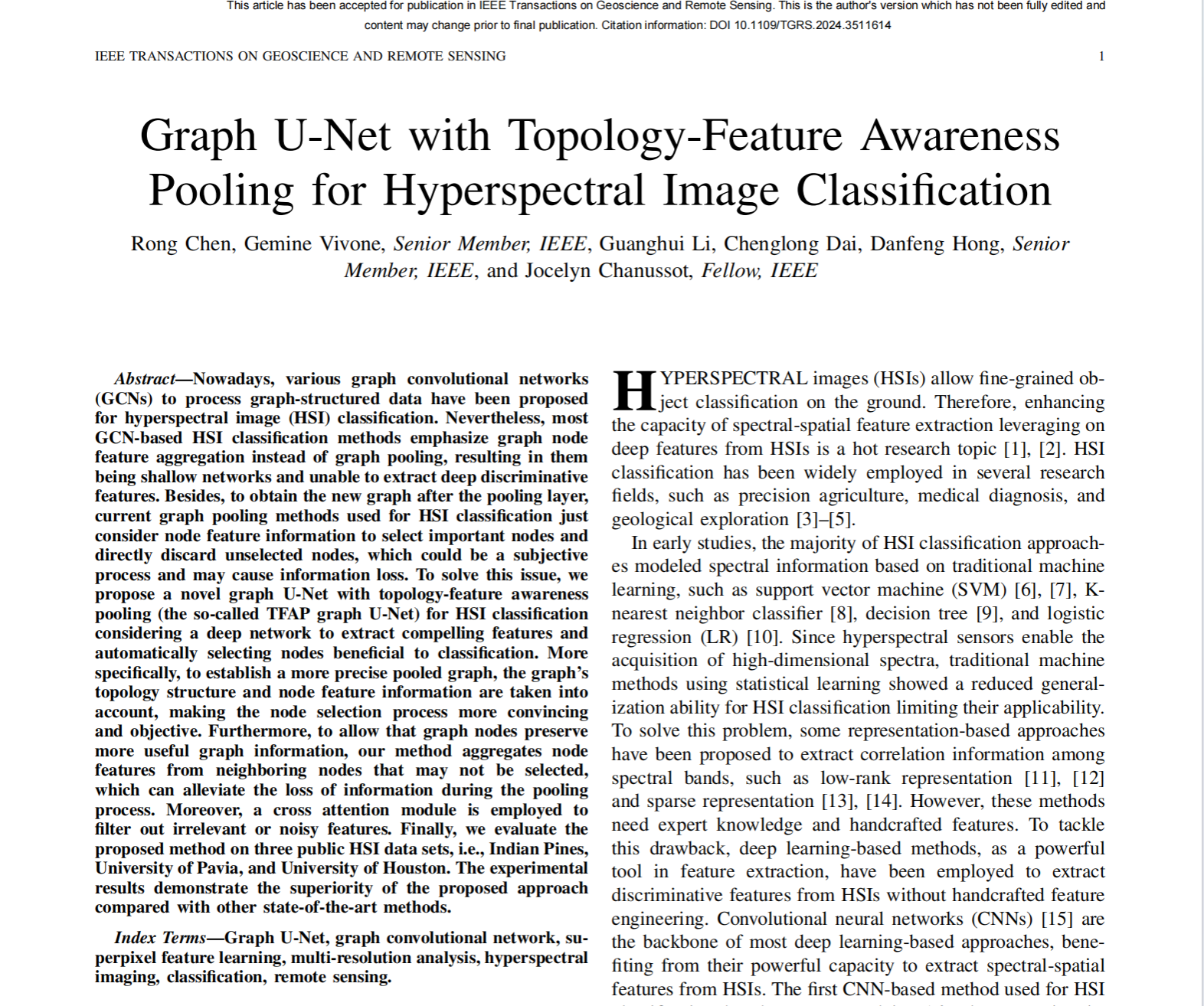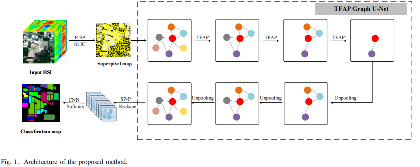 目前,大多数基于图卷积网络的高光谱图像分类方法强调图节点特征聚合而不是图池化,导致其浅层网络下无法提取深层判别特征。此外,为了在池化层后获得新的图,现有的用于高光谱图像分类的图池化方法只考虑节点特征信息来选择重要节点,并直接丢弃未选择的节点,可能会导致信息丢失。为了解决这个问题,提出了一种新的具有拓扑特征感知池的图U-Net用于高光谱图像分类,考虑利用深度网络来提取特征,并自动选择有利于分类的节点。更具体地说,为了建立更精确的池图,考虑了图的拓扑结构和节点特征信息,使节点选择过程更具客观性。