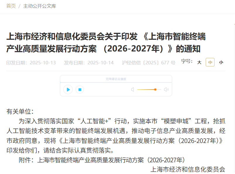 2025 年 10 月 14 日,上海市经济和信息化委员会印发《上海市智能终端产业高质量发展行动方案(2026 - 2027 年)》,明确加快 SoC、CPU 等核心芯片布局,覆盖 X86、ARM、RISC - V 三大技术路线,同时布局端侧 GPU 芯片发展,支持 3D 异构集成等关键技术突破,探索新型存储技术路线。