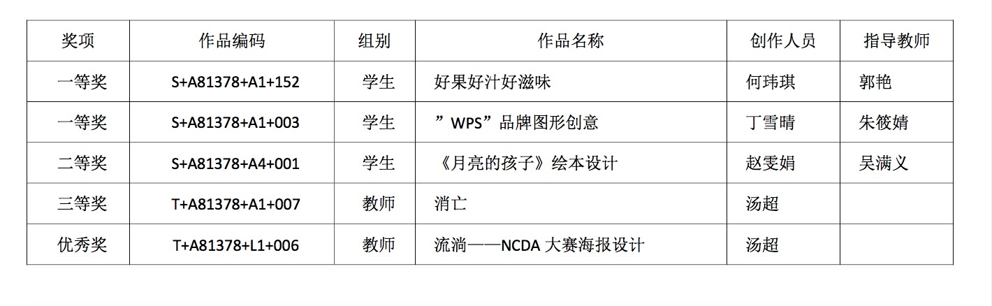 近日,第十届全国高校数字艺术设计大赛全国总决赛获奖名单正式公布,我校美术学院汤超老师的作品《消亡》和《流淌——NCDA 大赛海报设计》分别获得教师组全国三等奖和优秀奖;郭艳老师指导的何玮琪同学的作品《好果好汁好滋味》、朱筱婧老师指导的丁雪晴同学的作品《“WPS”品牌图形创意》获得学生组全国一等奖;吴满义老师指导的赵雯娟同学的作品《<月亮的孩子>绘本设计》获得学生组全国二等奖。