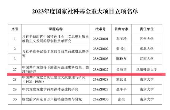 近日,全国哲学社会科学办公室公布了2023年度国家社科基金重大项目立项名单,我校吴海涛教授作为首席专家申报的《中国共产党领导下的淮河治理史料收集、整理与研究》获批2023年度国家社科基金重大项目立项,实现了我校在该级别项目的突破。此次重大项目的立项,既彰显了我校在淮河文化研究方面的优势地位、提升了我校承担国家重大科研项目的能力,又有力的支撑了我校博士点立项建设和一流高峰学科的高质量发展。