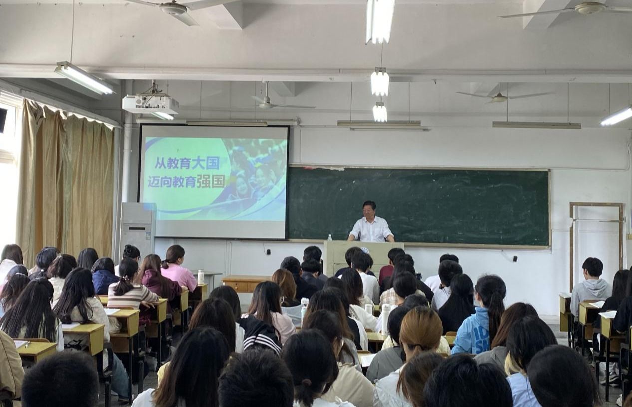 为坚持不懈用习近平新时代中国特色社会主义思想铸魂育人,全面推进党的创新理论最新成果进教材、进课堂、进头脑,5月9日,校党委书记程曦走进教室为2023级思想政治教育专业学生讲授题为《从教育大国迈向教育强国》的形势与政策课。马克思主义学院相关负责人、教师参加活动。
