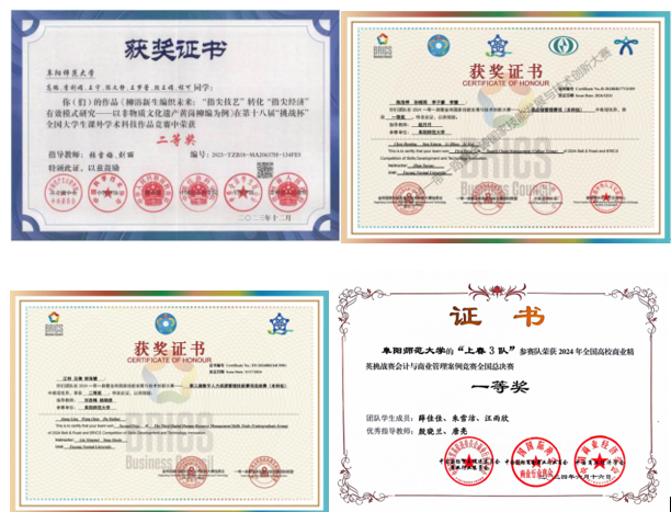 教师积极指导学生参加大学生创新创业大赛等各类国家级、省级竞赛,有效帮助学生将专业知识转化为实践能力。近三年来,学生参加互联网+、挑战杯、全国大学生市场调查与分析大赛等学科竞赛获得省级及以上奖励270项,其中,一类、二类赛事获奖203项,一类国赛获奖31项。2023年第十八届“挑战杯”全国大学生课外学术作品竞赛获国家级二等奖,创造了该项赛事的校史最好成绩。