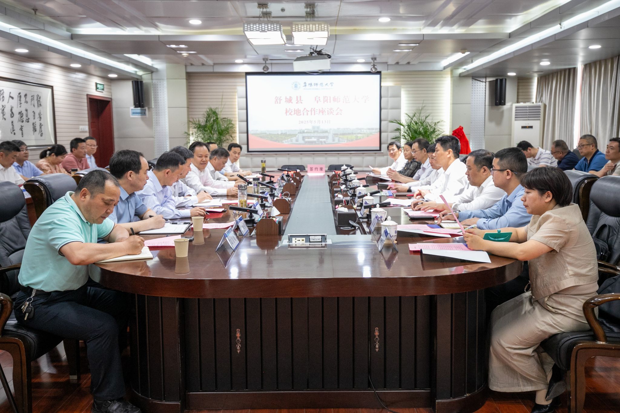 座谈会上,双方签署人才合作协议,并举行舒城县驻阜阳师范大学人才工作站揭牌仪式。