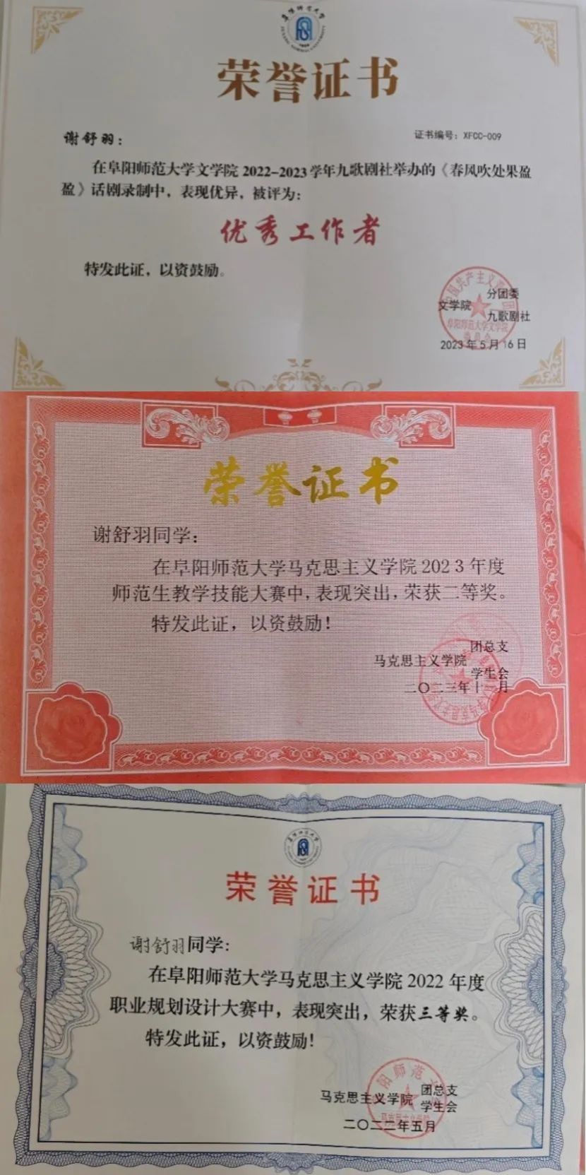 个人奖项:院级职业规划大赛三等奖、院级师范生技能比赛二等奖。