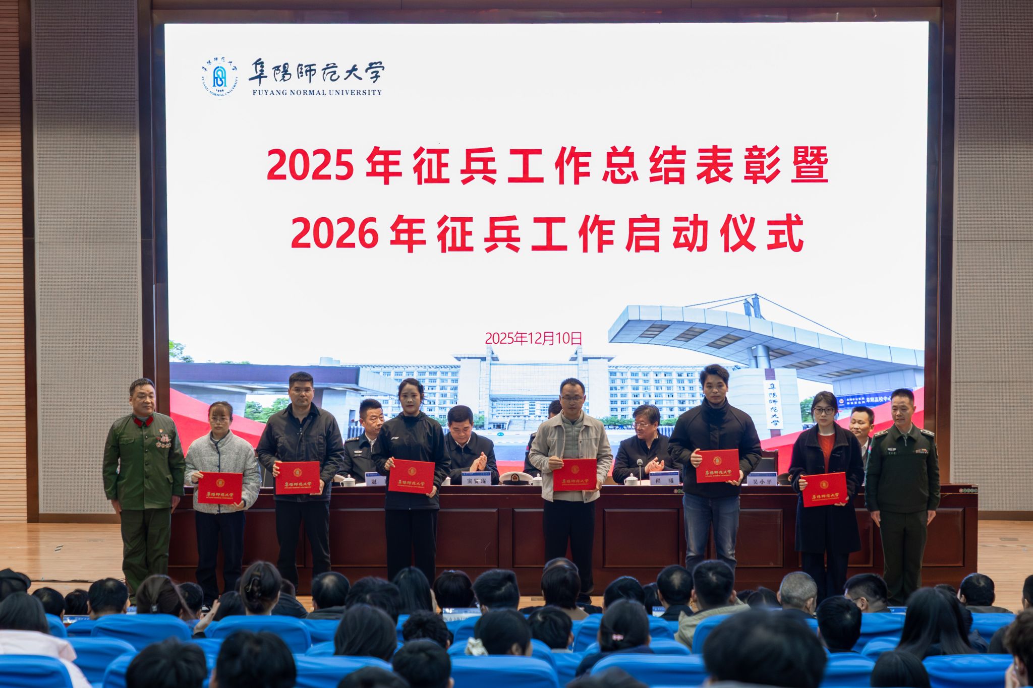 校党委常委、副校长窦贤琨宣读了2025年征兵工作表彰文件,对在2025年征兵工作中表现突出的教育学院、体育学院、美术学院、外国语学院、经济学院、数学与统计学院、商学院、生物与食品工程学院、阜阳医学院等9个先进集体和专职辅导员王敏等12名先进个人进行了表彰。