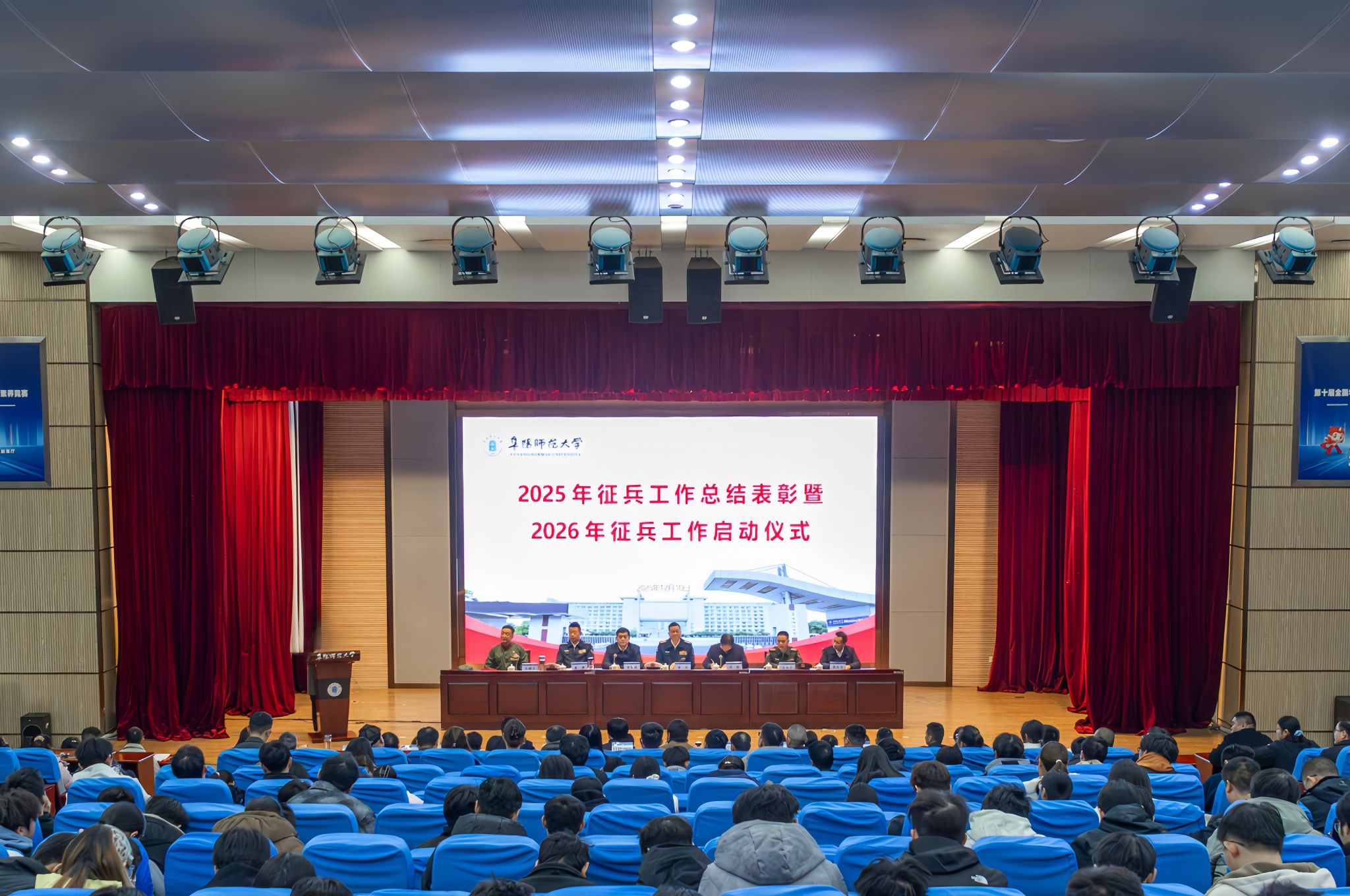 12月10日上午,学校2025年征兵工作总结表彰暨2026年征兵工作启动仪式在西湖校区正行楼二楼报告厅召开。校党委书记程曦,阜阳军分区司令员徐春,校党委常委、副校长窦贤琨,阜阳军分区战备建设处副处长吴小平,颍州区人武部政委赵刚出席大会,学校征兵工作领导小组成员单位负责人,二级学院党委(党总支)书记、副书记,全体专兼职辅导员,各二级学院征兵工作联络员,毕业班学生代表和学生军事兴趣类社团成员600余人参加大会。大会由窦贤琨主持。