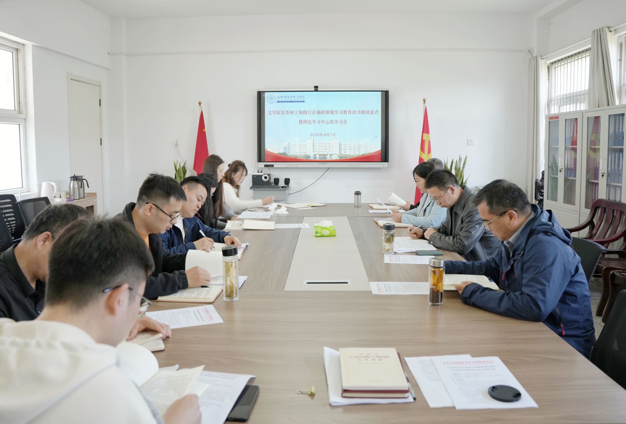 4月7日上午,文学院党委在三里桥校园B202会议室举行树立和践行正确政绩观学习教育读书班结业式暨理论学习中心组学习会。学院党政领导、党委委员、党支部书记、科级干部参加会议。会议由学院党委书记刘张飞主持。