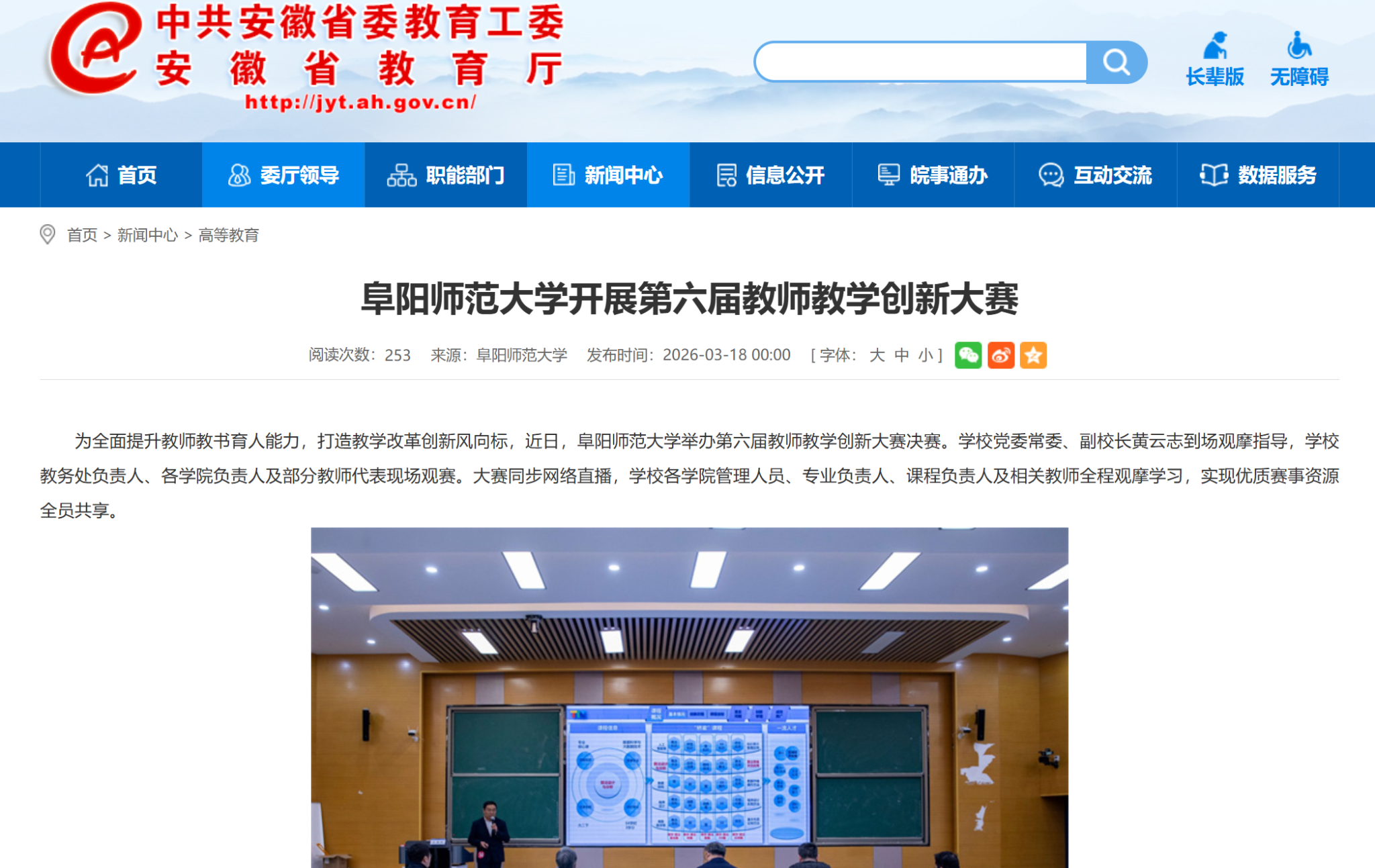 3月18日,安徽教育网报道:阜阳师范大学开展第六届教师教学创新大赛。文章地址: