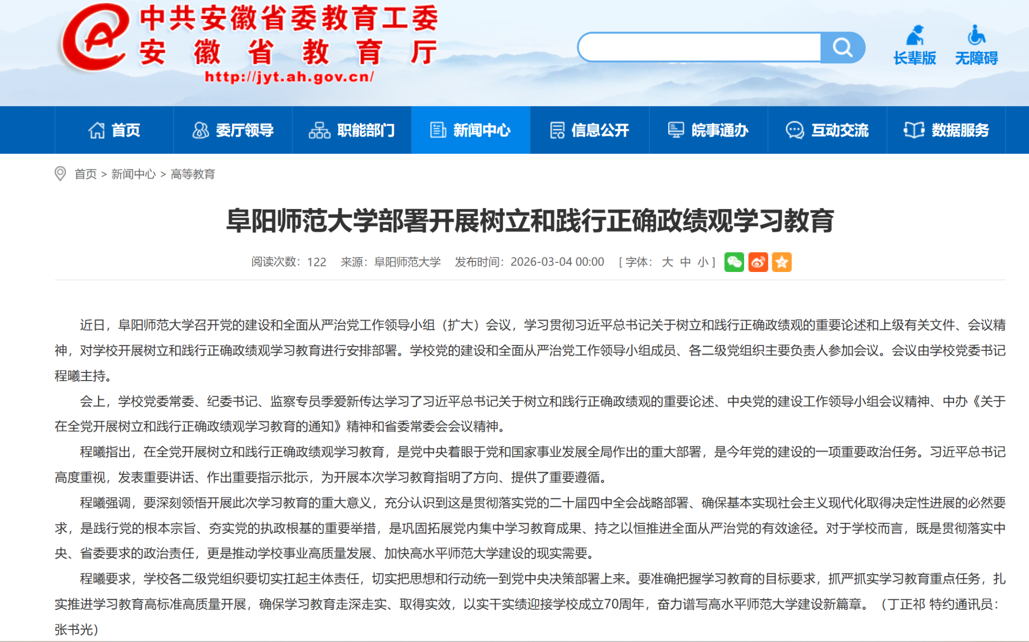 3月4日,安徽教育网报道:阜阳师范大学部署开展树立和践行正确政绩观学习教育。文章地址: