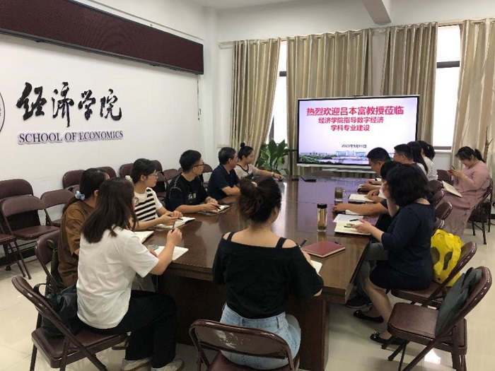 吕本富介绍了当前数字经济业态、数字技术和商业模式的经验定律、数字经济的发展形态和发展阶段等,分析了数字经济给学科发展、科学研究带来的巨大变革和挑战。吕本富强调,目前是数字经济的快速发展时期,抓好时代机遇发展数字经济学科、申报数字经济硕士点是十分必要的。青年教师也应该紧跟社会科学技术发展步伐,将科研方向朝数字经济聚焦,既有利于科研能力提升,又十分有助于学院发展数字经济学科并积累成果。交流互动环节,余许友就当前申报数字经济硕士点的相关问题与吕本富教授进行了充分讨论,与会教师也就数字经济科研和教学问题向吕本富虚心请教。