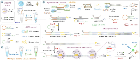 为确保食品安全,需要对沙门氏菌等病原体进行准确且简便的检测。然而,传统检测方法存在处理时间长、操作复杂以及准确性欠佳等问题。本研究通过杂交链式反应信号转导,将传统CRISPR检测中“一对一”的激活模式转变为“一输入、多激活”的协同放大模式。整个检测系统采用单管设计,操作简便,污染风险低,适合在资源有限的环境下开展现场快速筛查工作。此外,该技术采用模块化设计,只需更换识别序列,便能轻松适配其他病原体的检测。
