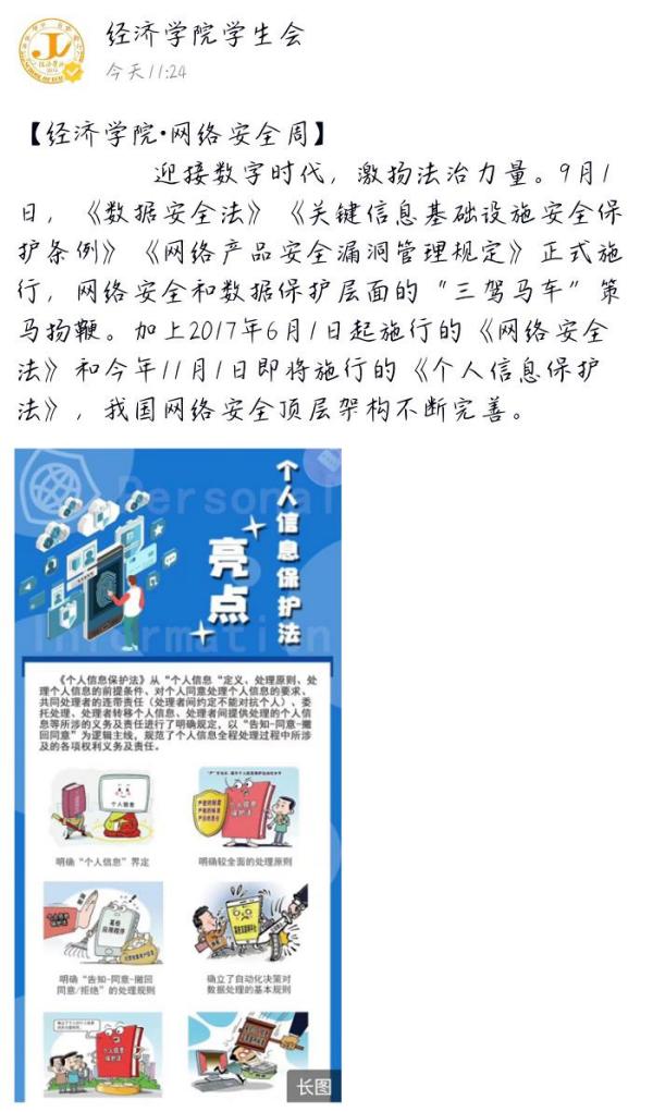 在“国家网络安全宣传周”活动期间,经济学院通过主题班会、官方QQ和微信公众号、宣传海报等多种形式进行全方位、多角度的网络安全宣传,营造了网络安全人人有责、人人参与的良好氛围。广大学生对基本的网络安全知识有了进一步的掌握,网络安全防范意识得到了增强,提升了识别和应对网络危险的能力。同时,经济学院举办了以网络安全为主题的线下征文及宣传画比赛,让学生在完成征文与绘画作品的过程中,将网络安全防范意识深深扎根在心中。