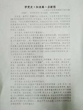 此次征文比赛以作品征集上交的方式开展,作品内容以自己在学习党史的过程中得到的收获与启示为主,积极向上,体裁不限。在这些征文作品中,有的是忆往昔峥嵘岁月,抒发内心真情;有的是结合自己在工作、学习、生活经历的实际,畅谈党领导下发生的巨大变化,取得的辉煌成果的切身感受;有的是写读书、观看革命传统教育影片读后感、观后感的;也有的是通过挖掘叙述身边起模范带头作用的优秀共产党员的形象,反映党员干部的动人故事。由经济学院挂职团委副书记杨柳和团委负责人关欣雨对本次大赛征集的作品进行认真评判和严格把关,评选出九名优秀作品。其中20级金融工程2班武佳凝同学的作品得到评委的一致认可,获得了此次征文比赛的一等奖。