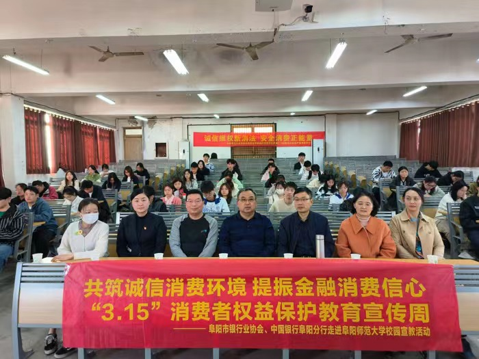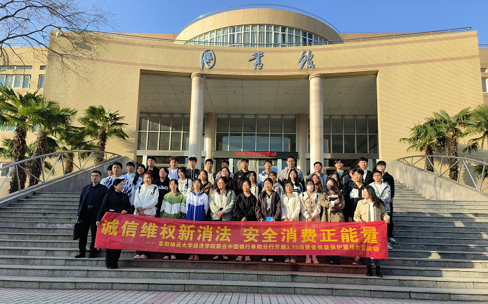 为进一步增强青年大学生的维权意识,树立正确的消费观,更好地运用法律手段维护自身的合法权益,3月14日,值第40个国际消费者权益日来临之际,经济学院联合阜阳市银行业协会、中国银行阜阳分行举办“诚信维权新消法 安全消费正能量”为主题的宣传教育活动。阜阳市银行业协会副秘书长许兵、中国银行阜阳分行团委书记关沛沛、中国银行阜阳分行师院支行行长张培培、经济学院党委副书记孟继超、团委负责人王静及各班学生代表参加此次活动。活动由王静主持。