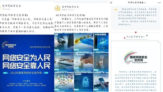 为深入学习贯彻落实习近平总书记关于网络强国重要思想,大力宣传网络安全工作的重要作用,进一步普及网络安全知识,营造安全、健康、文明的网络环境,保障师生在网络空间的合法权益,切实维护国家网络安全,9月4日至9月14日,经济学院特举办“国家网络安全宣传周”系列活动。