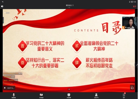 青年强,则国家强,新时代的中国青年生逢其时,重任在肩,施展才干的舞台无比宽阔,实现梦想的前景无比光明。时代的责任赋予青年,时代的光荣属于青年。2021级金融工程1班团支书孙怡擎以“百年薪火永赓续 青春逐梦跟党走”为主题,从学习党的二十大精神的重要意义等方面带领大家学习领悟党的二十大精神,同时通过视频展示了在中国共产党的领导下中国十年的伟大变革及在经济、科技、人民生活水平等方面取得的伟大成就等。