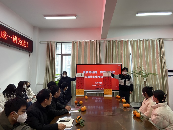 为有效推进2023届毕业生考研工作,进一步调动备考积极性,增强考研信心,摆正考研心态,经济学院于12月12日距离考研还有12天这个特殊的日子在西湖校区汉风B楼323会议室开展“筑梦考研路,青春正当时”为主题的考研冲刺动员会。学院党委书记房厚信、副书记孟继超、部分辅导员及考研学生代表参加了会议。