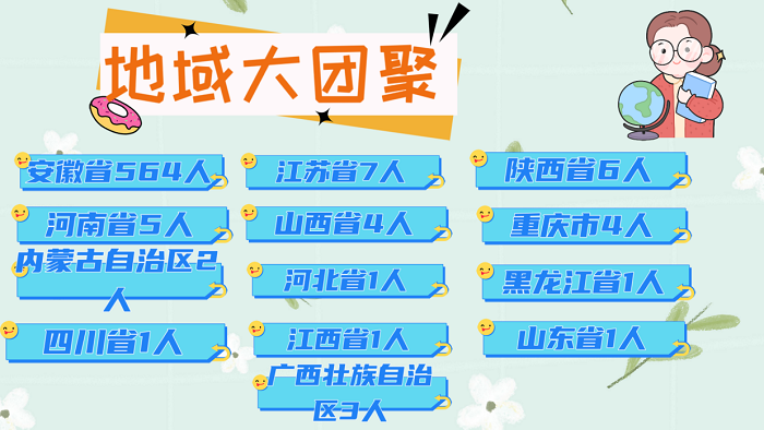 地域大团聚。今年来自安徽省的同学有564位,剩下分别来自陕西省,江苏省,重庆市,其中,3位同学来自广西壮族自治区,2位同学来自内蒙古自治区,1位来自黑龙江省,1位来自河北省,还有一位来自山东省。跨越山海前来相聚,成为良知挚友,共同开启美好的大学之旅。