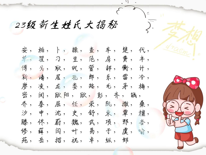 姓氏大调查。在今年的新生中,一共有161个姓氏,其中王,张,李,刘,分别以55位,38位,34位,31位,位居榜首;而安,柏,卜,操等姓氏,更是稀有程度满满,成为新生中独一无二的存在。