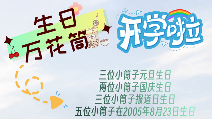 生日万花筒。前来报道的小萌新中,有三位同学在元旦当天生日,不仅是迎“新年”,更是迎“新生”;两位同学在国庆生日,与祖国母亲共度华诞;三位同学在报道期间生日,别忘了在初见时为他们送上生日祝福!还有五位同学在2003年8月23日这一天出生,一定是特别的缘分,让大家同年同月同日生!