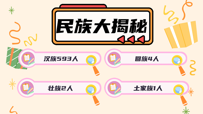 民族大揭秘。今年一共有593位汉族同学,4位回族同学,2位壮族同学,1位土家族同学,不知道这些少数民族同学会成为谁的密友呢。