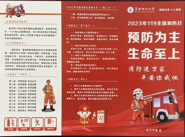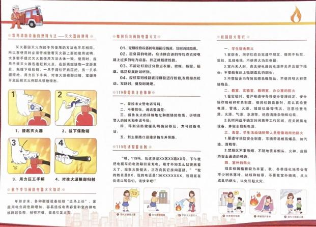 传知识火种,灭隐患气焰。为进一步加强校园消防安全知识普及和宣传,增强学生们的消防安全意识,让火灾远离校园,营造更加安全舒适的校园环境,学院印制了包含全国消防日的由来、什么是消防安全、火场逃生“十要诀”及学生宿舍、教室、办公室、实验室等场所如何防火等内容的消防安全知识宣传手册,同时,组织学院“一站式社区”功能型党支部党员分赴责任区宣传消防安全知识并发放消防安全知识宣传手册,切实增强了学生们的消防安全意识及一定的应急自救能力。