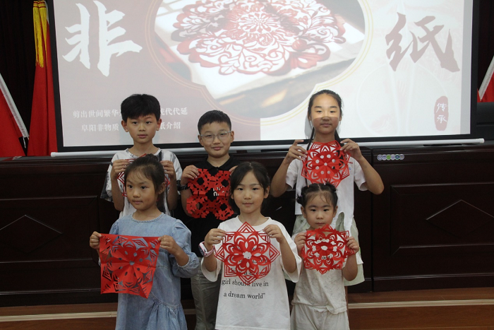 非遗课堂:剪刀下的千年传承。活动中,志愿者以阜阳剪纸国家级非遗项目为切入点,通过一张张精巧的剪纸向孩子们讲解其历史渊源:“阜阳剪纸可追溯至南北朝时期,盛于明清,以剪刀或刻刀在彩纸或宣纸上创作出丰富多样的图案,其艺术风格融合了南方剪纸的纤巧秀美与北方剪纸的稚拙浑厚,呈现出粗犷朴实又不失细腻灵动的特点,体现了皖西北劳动人民的生活情感与审美追求”,2008年被列入国家级非物质文化遗产名录。