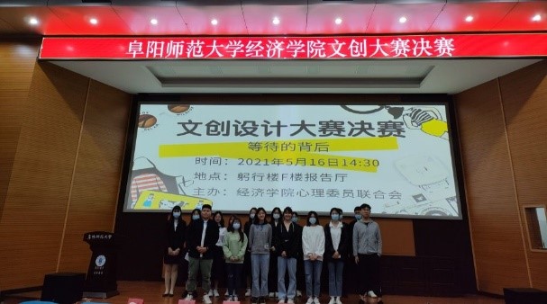 经济学院心理委员联合会于2021年5月12日选出优秀作品进入决赛。本次文创比赛决赛于2021年5月16日下午2:30在躬行楼F楼报告厅举办。决赛现场气氛活跃,参赛选手积极参与、认真准备,参赛作品创意十足,背后内涵更是引人深思。决赛开始阶段,各位参赛选手按照顺序依次上台展示团队文创作品并加以释意,展现了阜师大学子的精神风貌。比赛尾声之时,评委进行了现场点评,给出了宝贵的意见。经过激烈的打分环节后,本次大赛评选出一等奖、二等奖、三等奖以及若干优秀奖。比赛结束后,参赛选手和评委们进行合影留念。