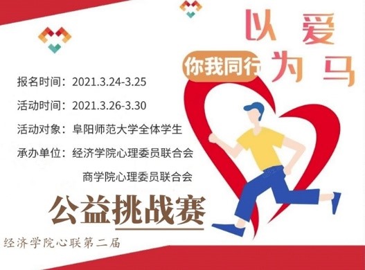 为了响应国家全民运动的号召,鼓励我校同学积极参加体育健身活动,并通过毅行活动进行慈善捐赠。经济学院与商学院心理委员联合会于2021.3.26-3.30联合举办“你我同行”公益挑战赛,将绿色运动与公益活动相结合,进行步数捐赠公益活动,在提高自我素质的同时,为需要的人送去温暖。本次挑战赛的活动对象为阜阳师范大学全体学生。