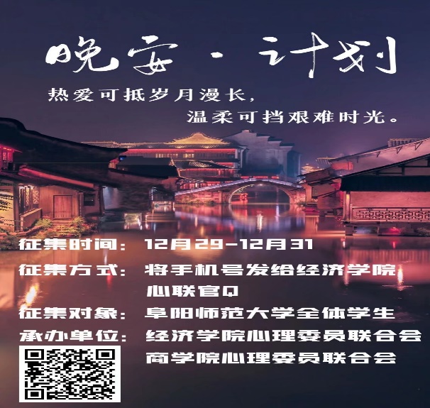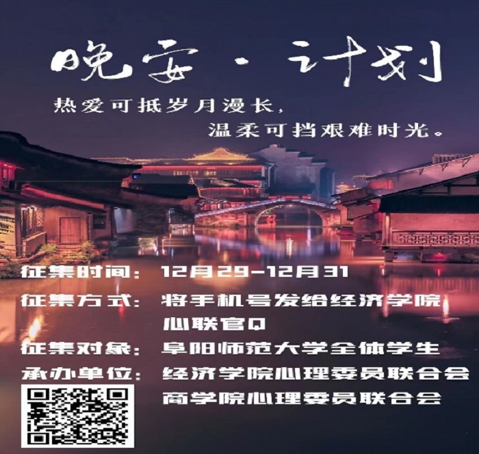 为了让经济学院的学子们在新的一年里继续保持健康的心理状,展现当代大学生蓬勃的朝气,经济学院心理委员会于2020年12月29日举办了以“愿所求皆如愿,所行化坦途”为主题的“晚安计划”活动。此次活动面向阜阳师范大学经济学院全体师生展开。