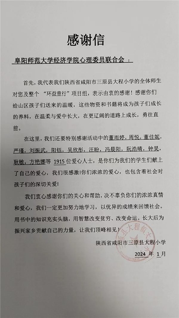 在所有人的共同努力下,本次活动反响热烈,成果斐然。截至今日,共有1915名同学参与了本次公益活动,总计捐赠了1255份爱心物资,爱心文具755份,爱心书籍500册带着爱与温暖的图书被送往陕西省咸阳市三原县大程小学。感谢所有参与本次公益捐书活动的同学们,其中额外感谢董雨婷同学额外捐献的20份爱心物资。大家的爱心托举起了山区孩子们的阅读梦。掠过晨光熹微的十二月天,孩子们沐浴书香,前方的路灿烂千阳。