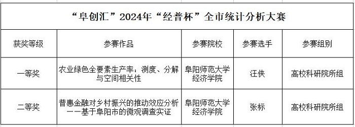 近日,由阜阳市统计局、阜阳市人力资源和社会保障局主办的2024年全市统计分析大赛成功举办,来自全市高校科研院所、市统计局、县市区统计局等18所单位部门的29名选手参赛,经过激烈角逐,学院汪侠博士的作品《农业绿色全要素生产率:测度、分解与空间相关性》荣获一等奖、张标副教授的作品《普惠金融对乡村振兴的推动效应分析——基于阜阳市的微观调查实证》荣获二等奖。