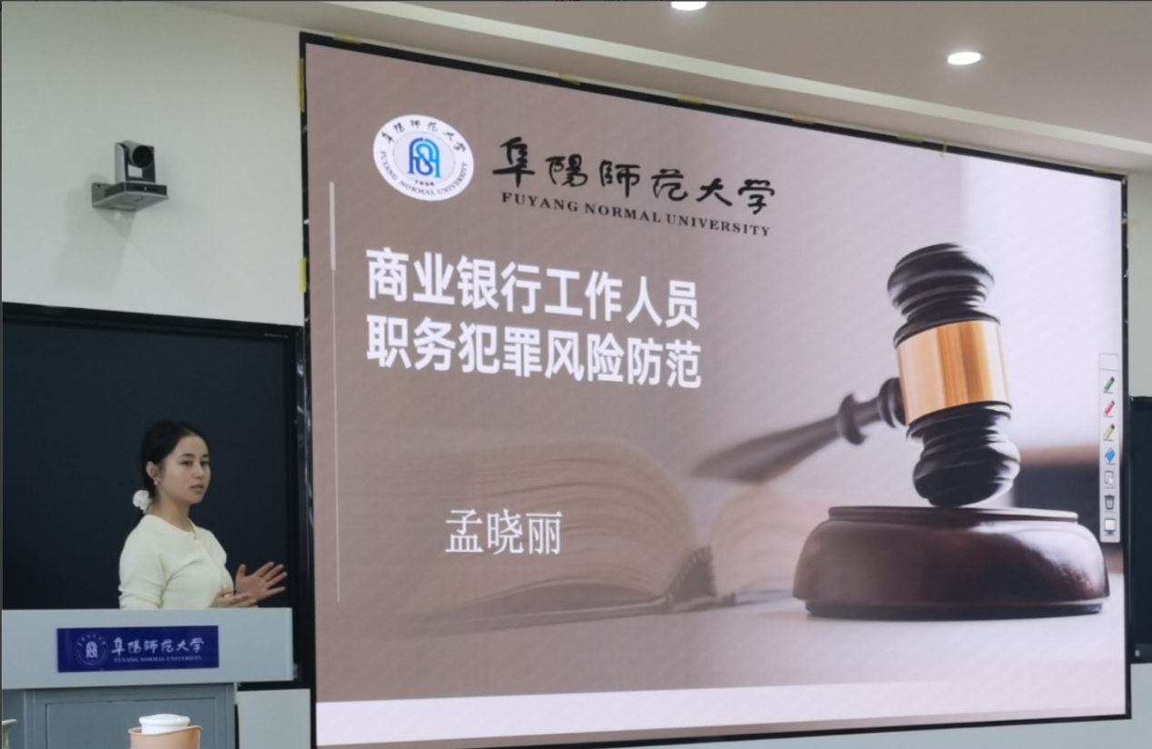 孟晓丽在讲台上演讲《商业银行工作人员职务犯罪风险防范》