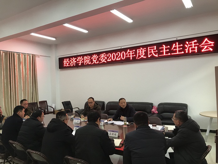 2021年1月29日,经济学院党委领导班子2020年度民主生活会在汉风楼B楼323会议室召开。会议由党委书记黄琼主持,经济学院党委领导班子成员出席会议。经济学院工会主席兰冲锋列席会议。校纪委副书记李国强到会指导。