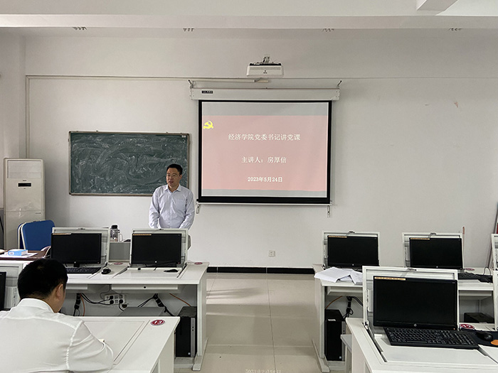为扎实推进学习贯彻习近平新时代中国特色社会主义思想主题教育,5月24日下午,经济学院党委书记房厚信为学院全体教职工讲授专题党课。