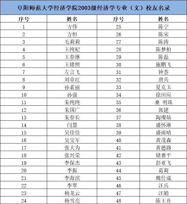 阜阳师范大学经济学院2003级经济学专业(文)校友名录