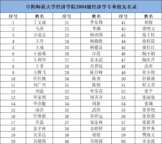 阜阳师范大学经济学院2004级经济学专业校友名录