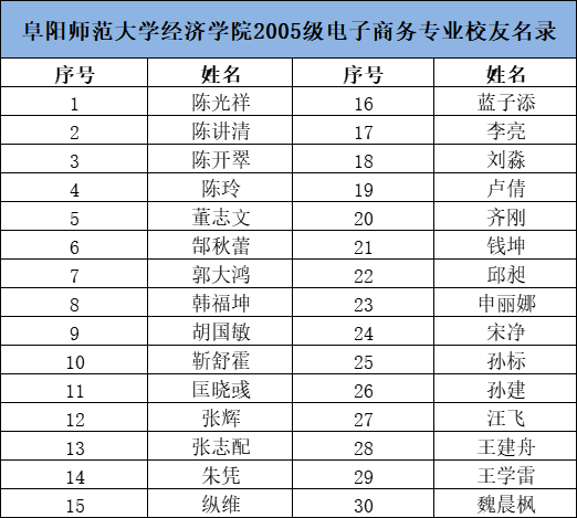 阜阳师范大学经济学院2005级电子商务专业校友名录