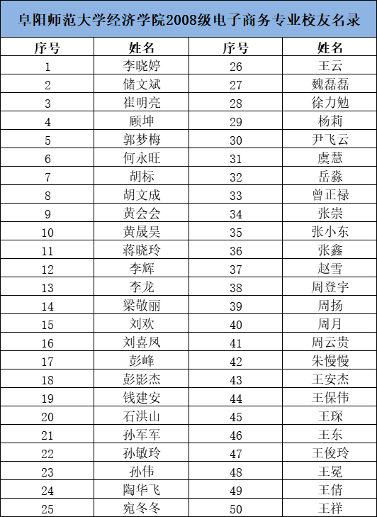阜阳师范大学经济学院2008级电子商务专业校友名录