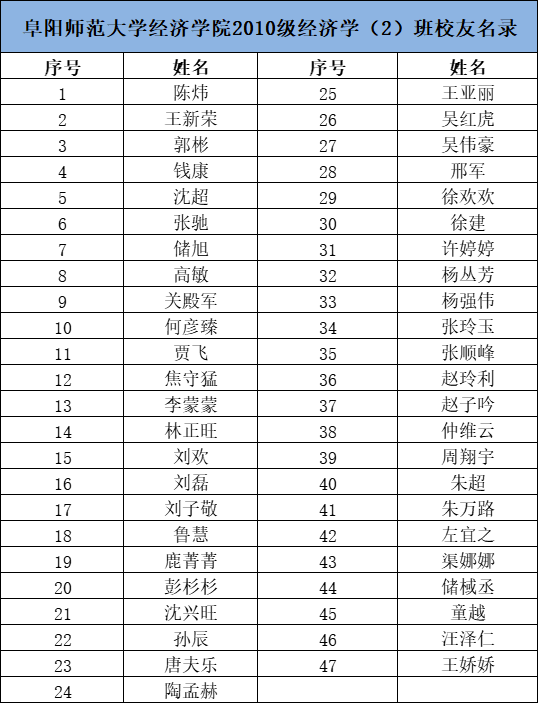 阜阳师范大学经济学院2010级经济学(2)班校友名录