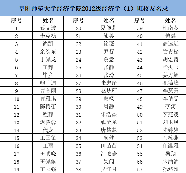 阜阳师范大学经济学院2012级经济学(1)班校友名录