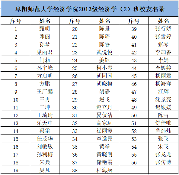 阜阳师范大学经济学院2013级经济学(2)班校友名录