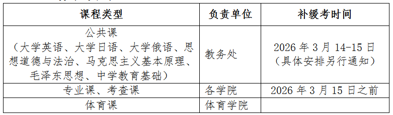 1.公共课补缓考由教务处安排,集中安排在3月14-15日(第三周周末)进行,详见《2025-2026学年第二学期公共课补缓考安排表》(另行发布)。