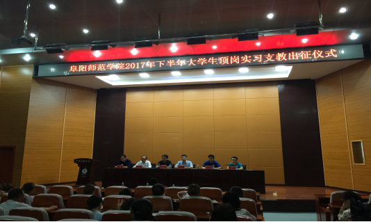 2017年9月8日下午,我校2017年下半年赴阜南县中小学、阜阳市经济开发区初级中学、插花中学等地方顶岗实习支教大学生出征仪式在西湖校区F楼报告厅举行。来自阜南县教育局及各实习支教学校相关领导出席仪式,我校教务处及相关学院负责人、校内指导老师及106名顶岗实习生共同参加出征仪式,仪式由教务处实践科科长李欢主持。
