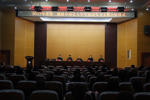 2017年4月14日下午,我校第二批赴阜南县顶岗实习支教大学生出征仪式在西湖校区F楼报告厅举行。来自阜南县教育局及实习支教学校相关领导出席仪式,我校教务处、文学院、外国语学院、政法学院、物理与电子工程学院、美术学院、音乐舞蹈学院、数学与统计学院等单位相关负责人、校内指导老师及第二批105名顶岗实习生共同参加出征仪式,仪式由教务处教师教学发展中心副主任房厚信主持。