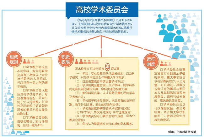 《规程》明确,高校应当依法设立学术委员会,作为校内最高学术机构,发挥在学科建设、学术评价、学术发展和学风建设等事项上的重要作用,统筹行使学术事务的决策、审议、评定和咨询以及学术纠纷裁定处理等职权。