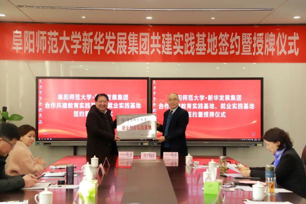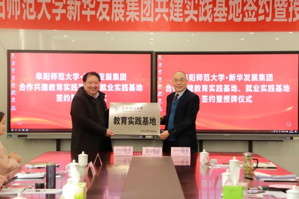 1月8日,阜阳师范大学与新华发展集团合作共建教育实践基地、就业创业实践基地签约仪式在北京外国语大学附属新华外国语学校举行。校党委常委、副校长汪芳启,校党委委员、教务处处长张宏,教务处副处长房厚信,创新创业学院副院长徐朝东,教育学院院长李欢,新华发展集团副总裁卞真勤,新华幼教集团董事长周建华,北外附属新华外国语学校校长周慰,新华幼教集团总经理吴敏志,北外附属新华外国语学校党委书记、副校长卢大荣等出席仪式。在与会人员共同见证下,双方签署合作共建教育实践基地协议和就业创业实践基地协议。汪芳启为基地授牌。