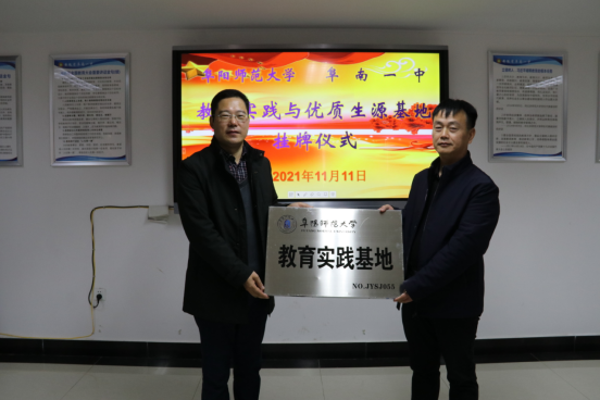 为拓展优质教育实践和生源基地,加强师范生教育实践,提高师范生培养质量,11月11日,招生就业处处长方强、数学与统计学院院长盛兴平、教务处副处长房厚信等一行赴阜南县,与阜南一中签订共建教育实践基地协议,并举行“阜阳师范大学教育实践基地”“阜阳师范大学优质生源基地”挂牌仪式。仪式由阜南一中副校长黄豹主持,该校校长李进、副校长丁宗、教导主任、年级部主任和我校数学与应用数学专业6名实习生、实习指导教师参加了授牌仪式。